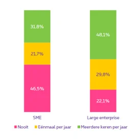 Het overgrote deel van de respondenten uit het onderzoek (83%) is bezorgd om (opnieuw) geconfronteerd te worden met een cybersecurity incident. En aangezien de meerderheid van de succesvolle hacks voortkomt uit social engineering, is het een logisch gevolg dat bedrijven een inhaalslag gaan maken met het vergroten van het bewustzijn van medewerkers op het gebied van cybersecurity. Momenteel biedt 24 procent van de bedrijven eenmaal per jaar hierover een training aan en 37 procent biedt dit al meerdere keren per jaar aan. Grotere organisaties lopen hierbij ver voor op het MKB (zie figuur).
